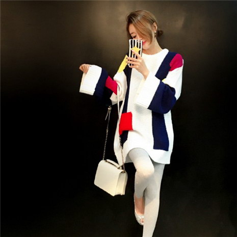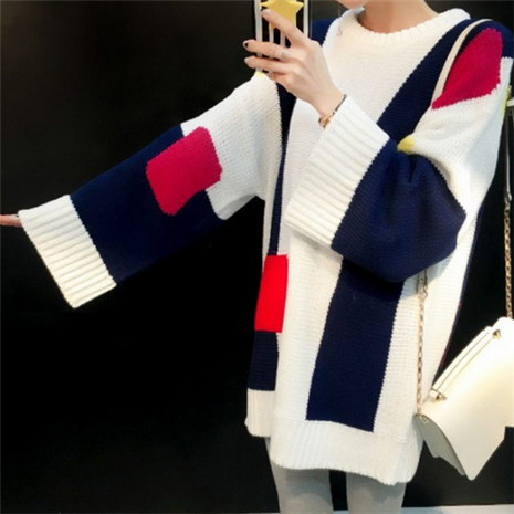 秋冬新款韩版几何多色拼接中长款套头毛衣