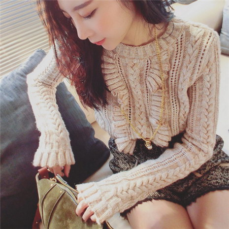 华丽宫廷风浅咖色夹花针织荷叶边套头短毛衣